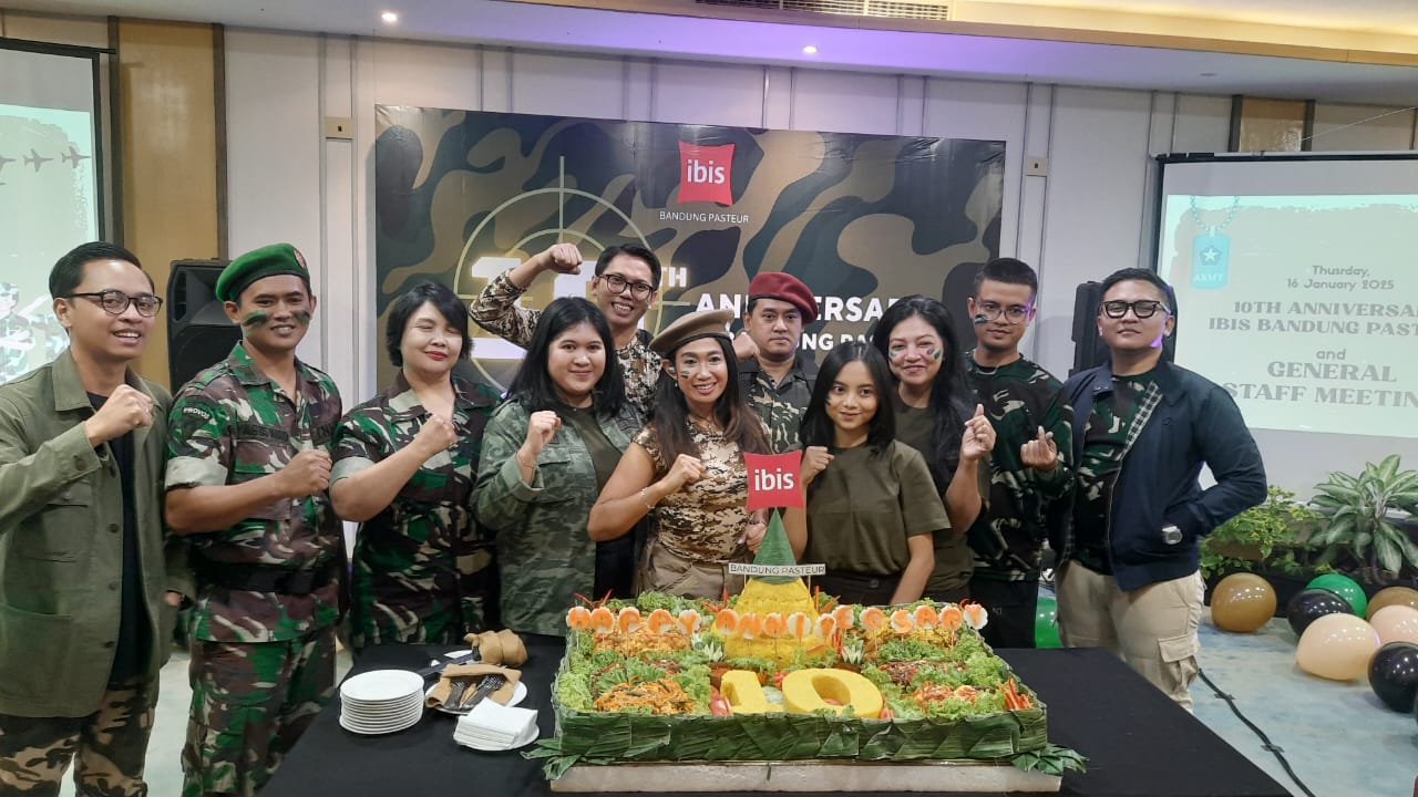 LIPUTAN BANDUNG – Dalam rangka merayakan ulang tahun yang ke-10, Ibis Bandung Pasteur menggelar acara General Staff Meeting yang dihadiri oleh seluruh staf hotel, dengan tema yang penuh semangat dan kekompakan: “Army” pada Kamis 16 Januari 2025.